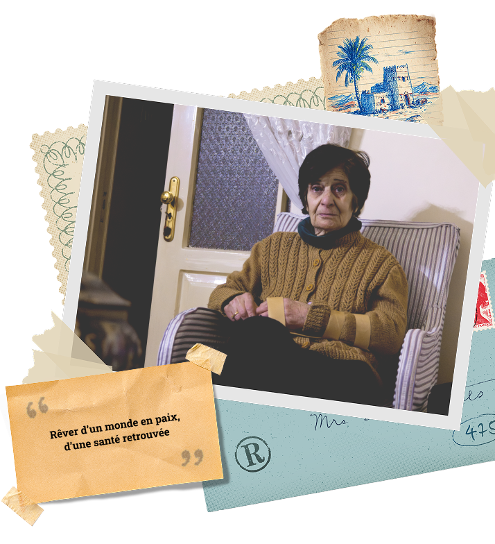 Depuis le décès de sa mère il y a six mois, Denise vit seule dans un petit appartement de Beyrouth. Atteinte d’une maladie dégénérative, elle perd progressivement la vue à tel point que, depuis deux ans, elle ne distingue même plus la lumière de son salon. Et depuis la mort de sa mère, il y a six mois, elle vit seule, sans repère, sans appétit, comme si la vie avait perdu tout goût. À chacune des visites de nos volontaires, qui lui apportent un plat chaud, préparé pour elle, pour l’aider à se nourrir un peu, pour lui redonner de la force, Denise raconte ses histoires d’amour dont celle avec un certain Joseph, son grand amour d’autrefois, ou ses souvenirs d’enfance, quand elle jouait avec ses frères et sœurs.